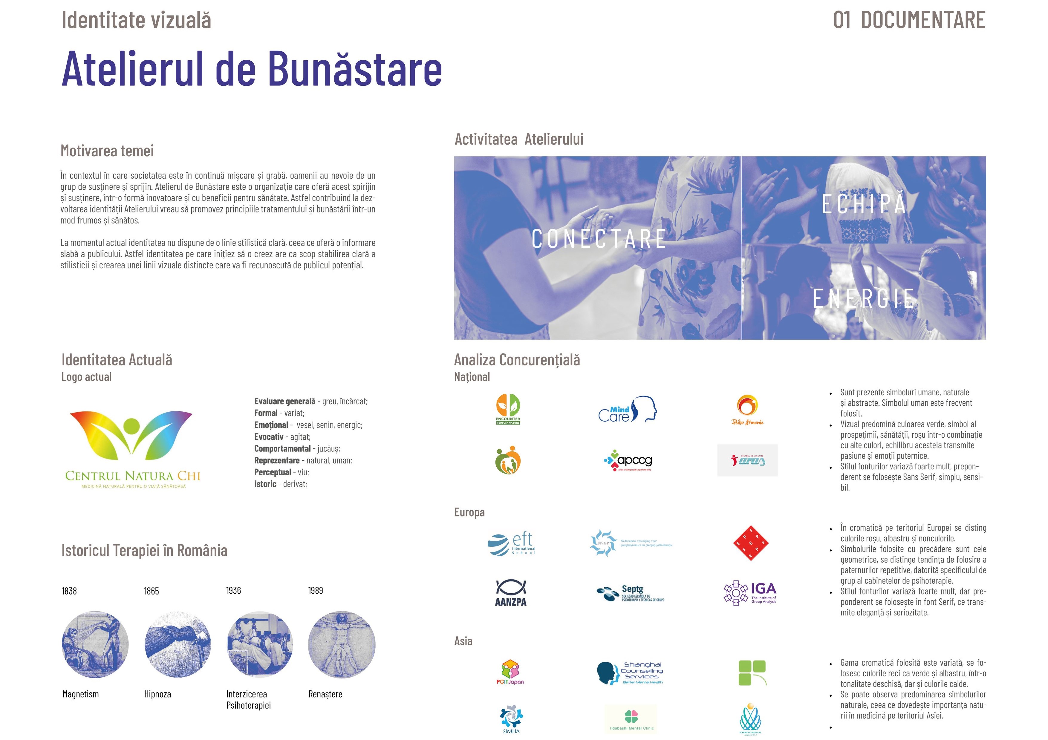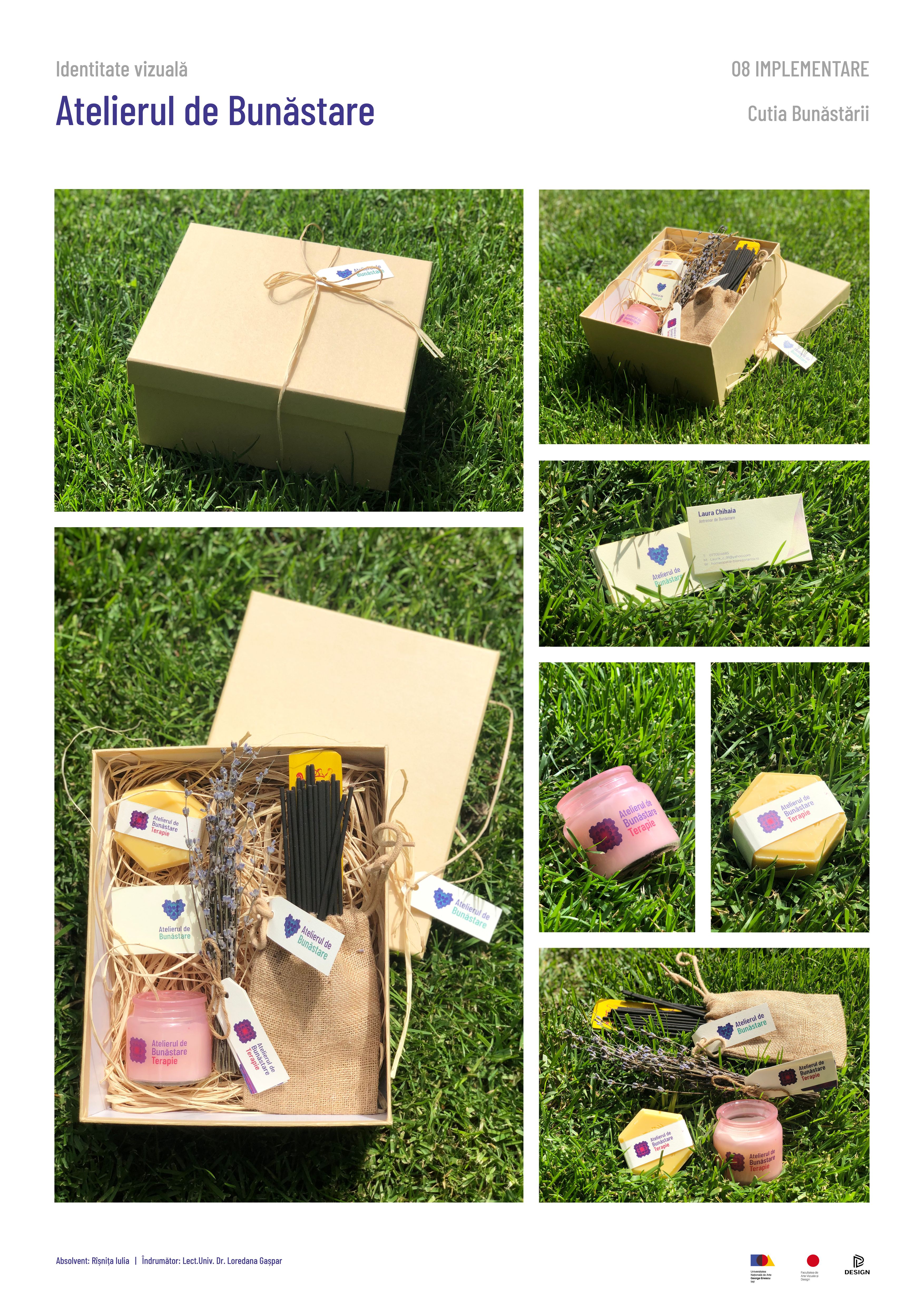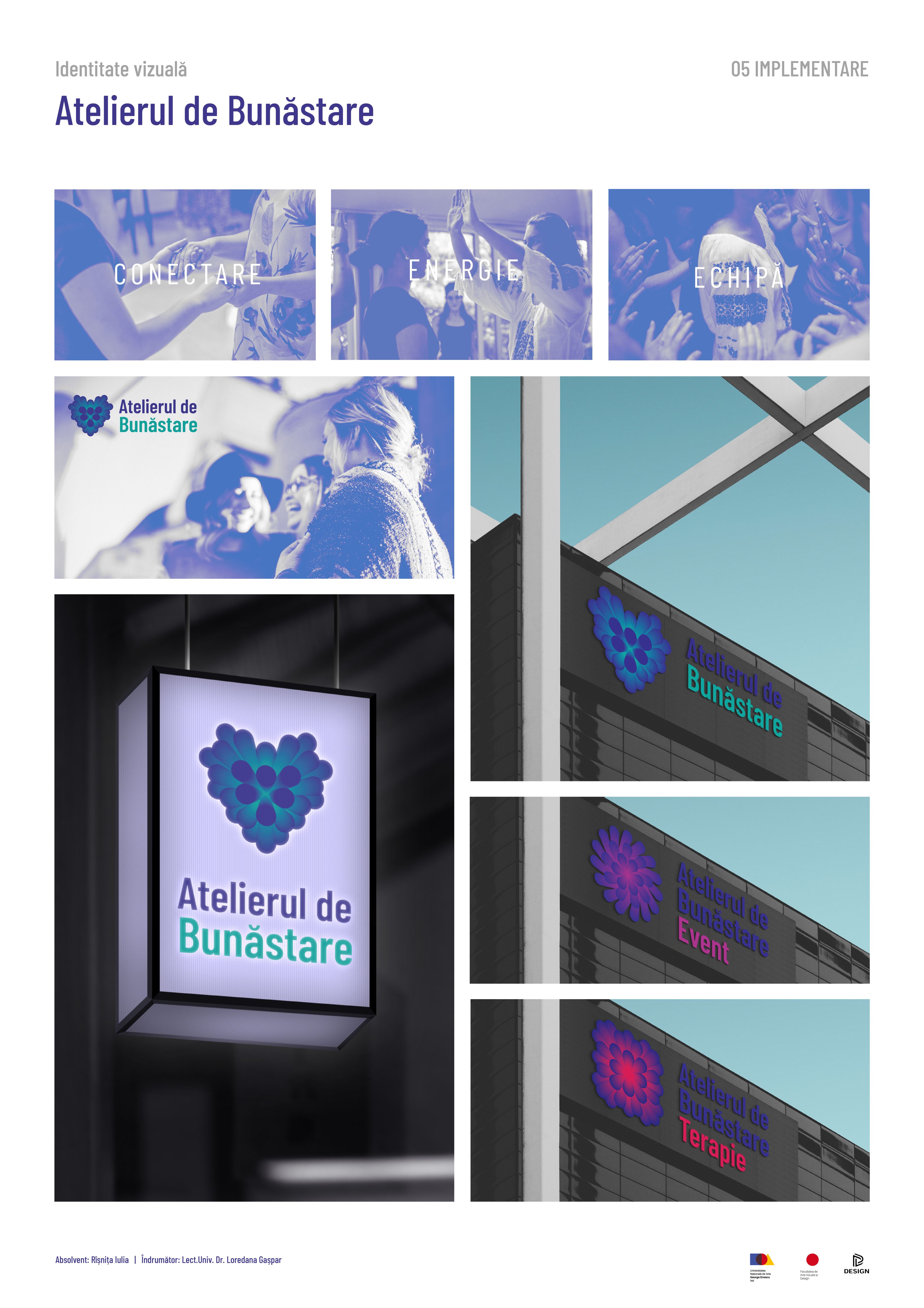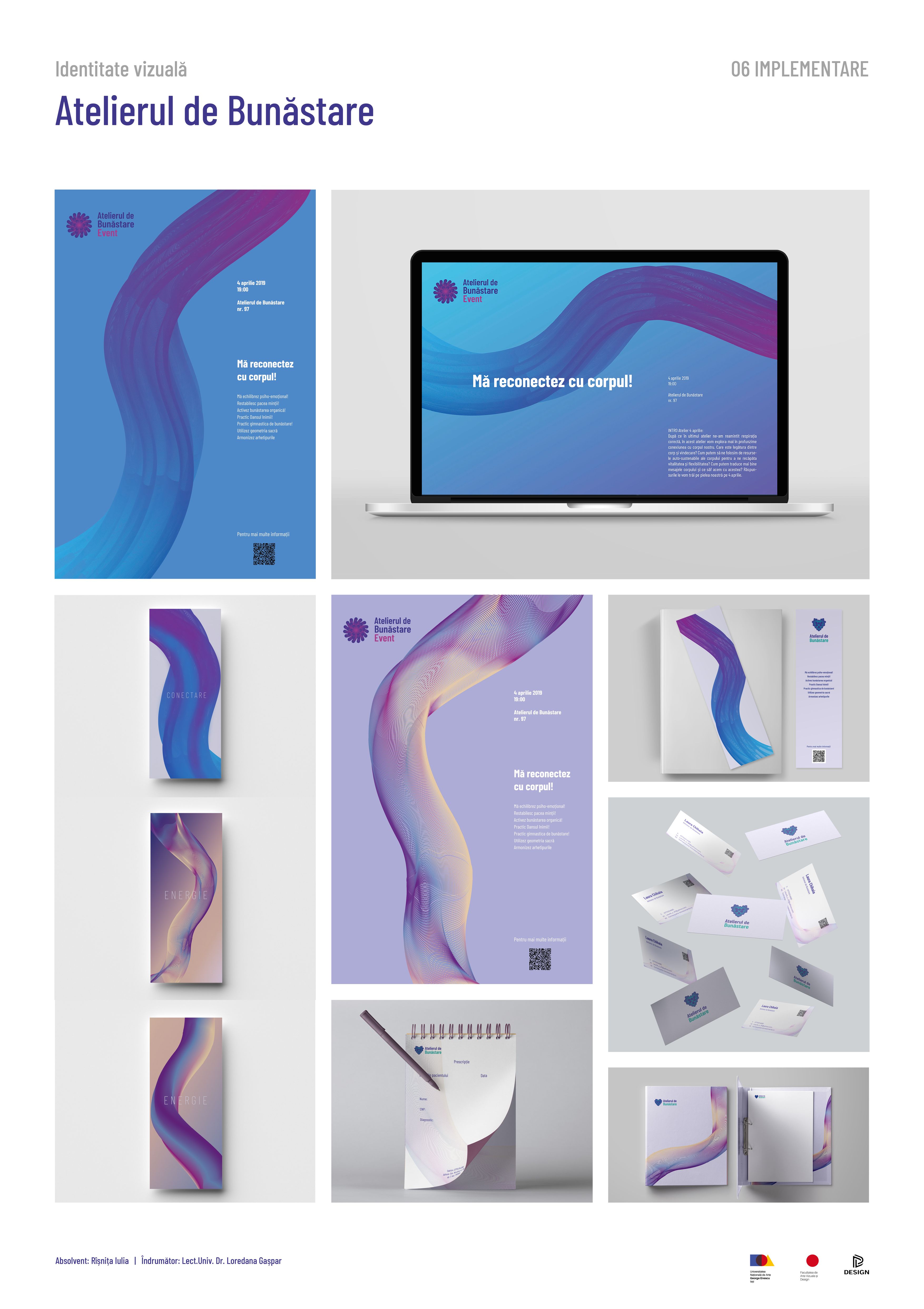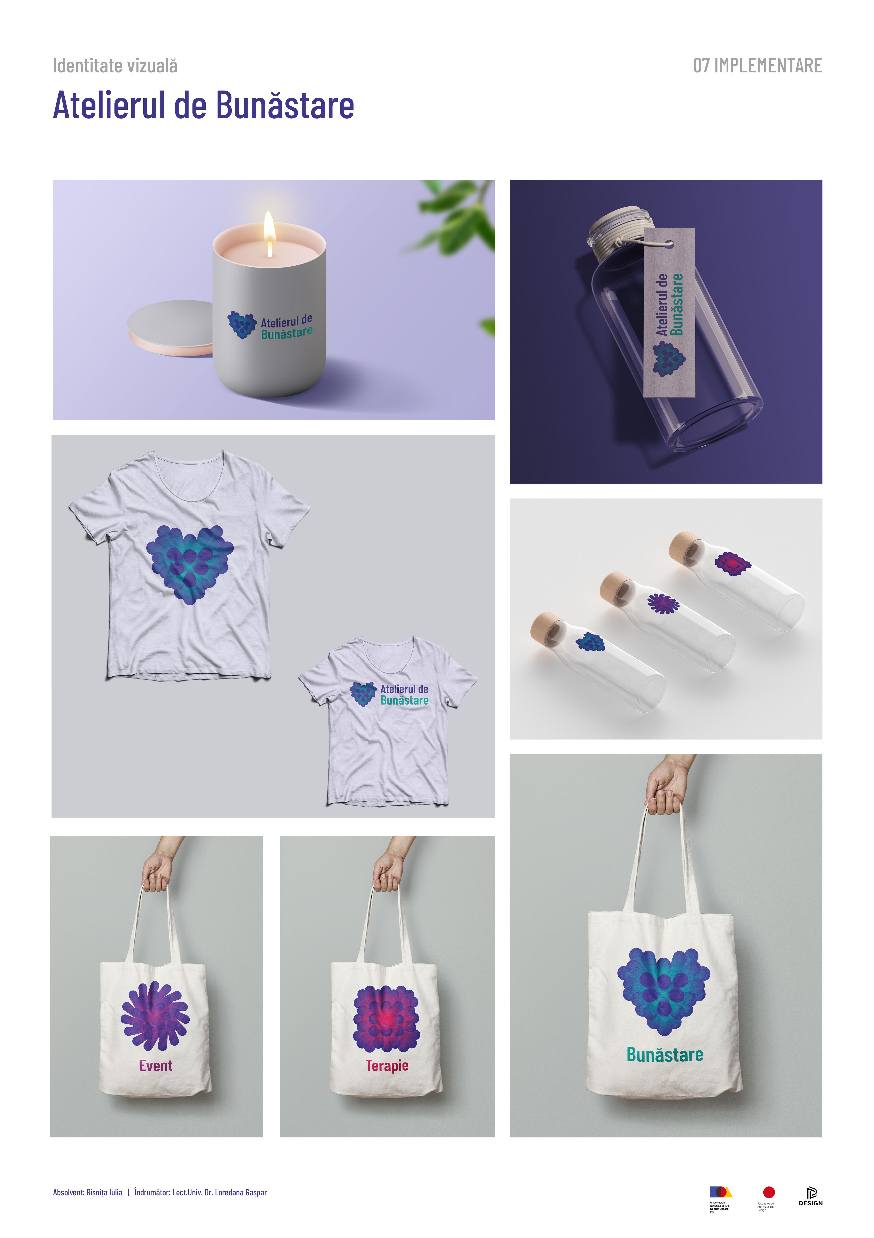 Identitatea vizuală este realizată pentru cabinetul de psihoterapie de grup și medicină alternativă din Iași, „Atelierul de Bunăstare”. Identitatea vizuală este creată prin intermediul logo-urilor celor trei departamente; cel de terapie, de evenimente și cel general. Elementele definitorii țin de cromatica relaxantă, liniile interconectate, simboluri, precum inima, spirala, și formele de bază: cerc, pătrat, triughi. Materiale de promovare create: postere și banere pentru evenimente, carnețel pentru prescripții medicale, semne de carte, cutia bunăstării (conține bețișoare aromate, lumânări aromate, săpun natural din miere și propolis) etc.