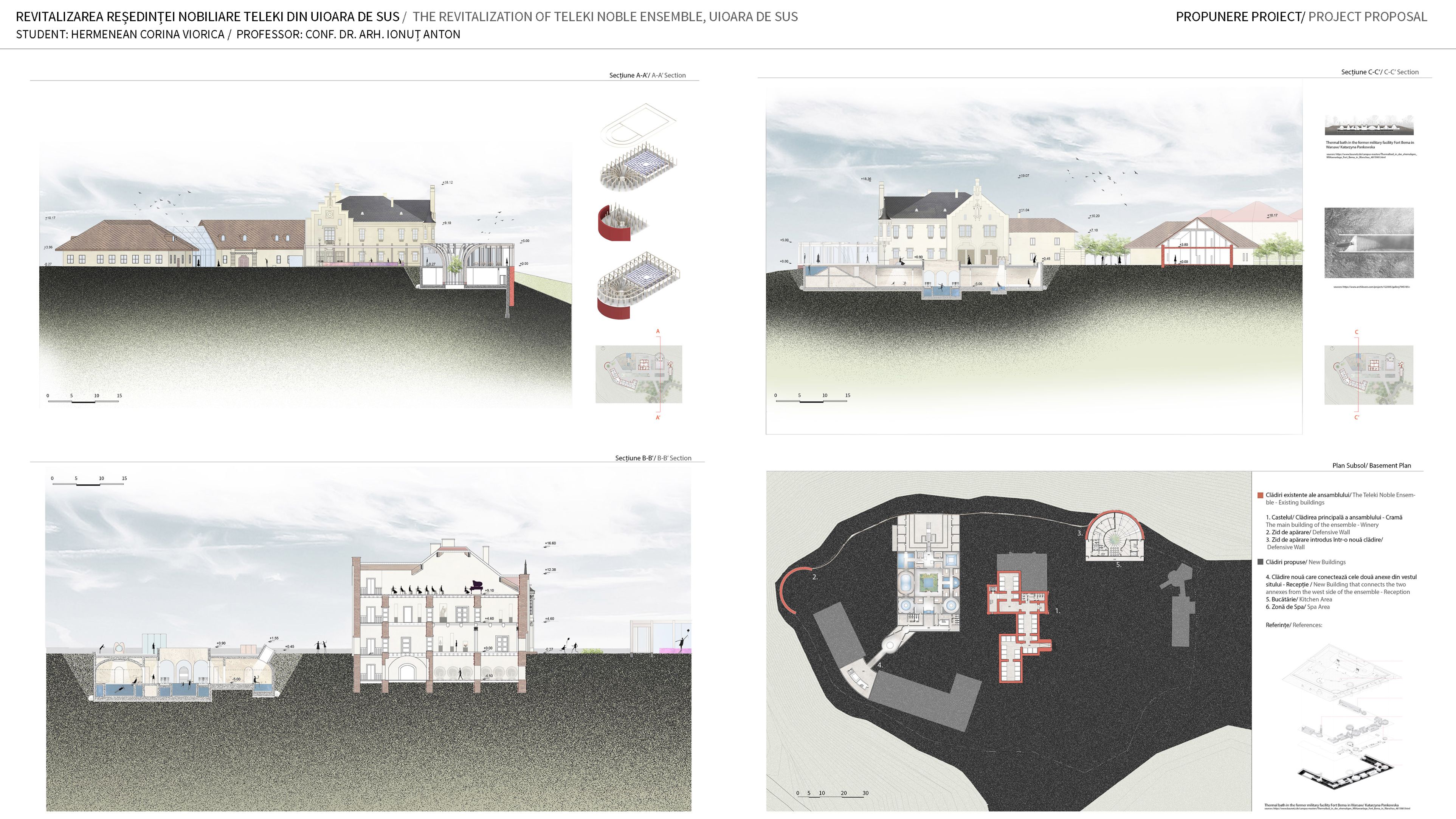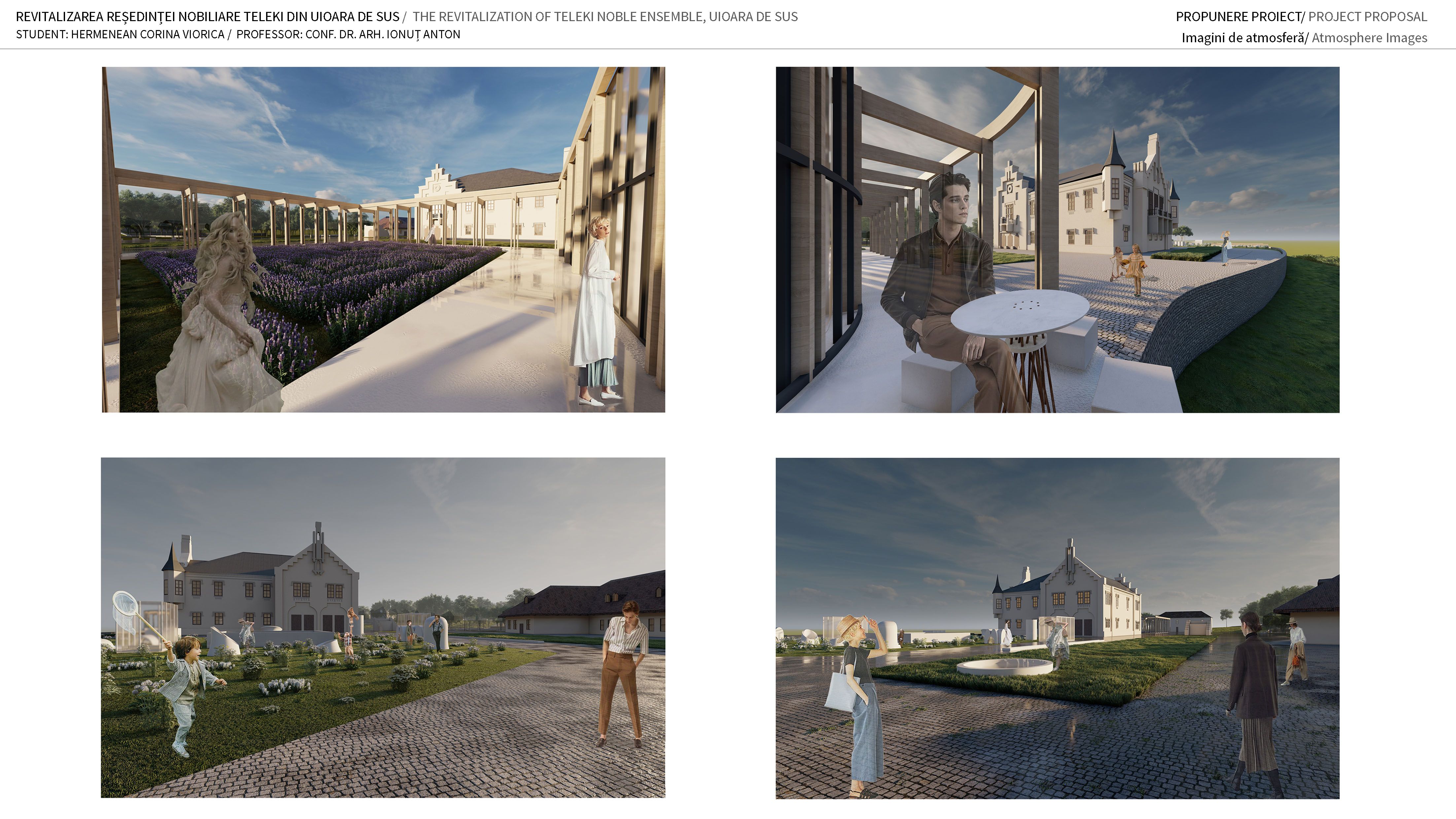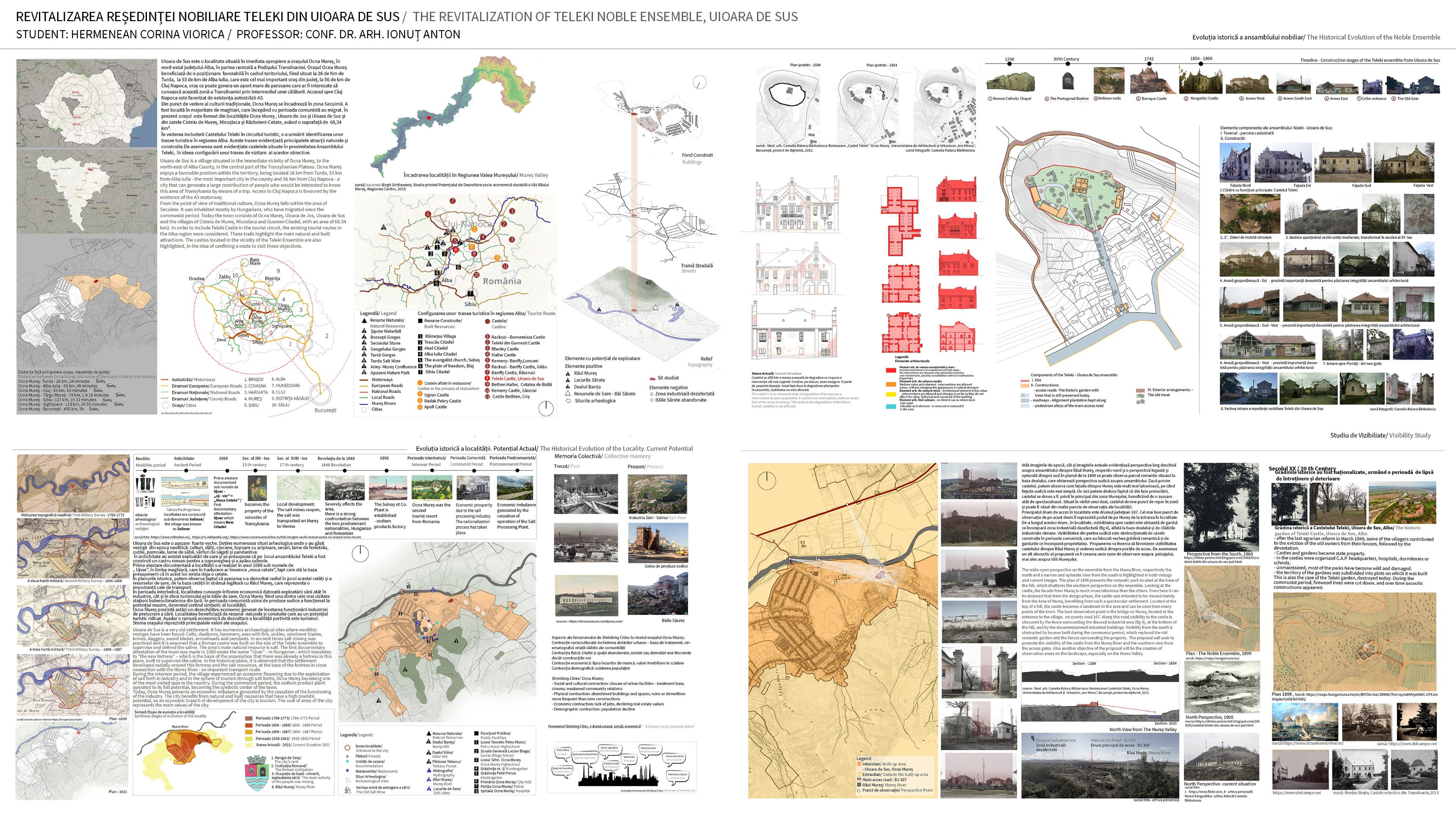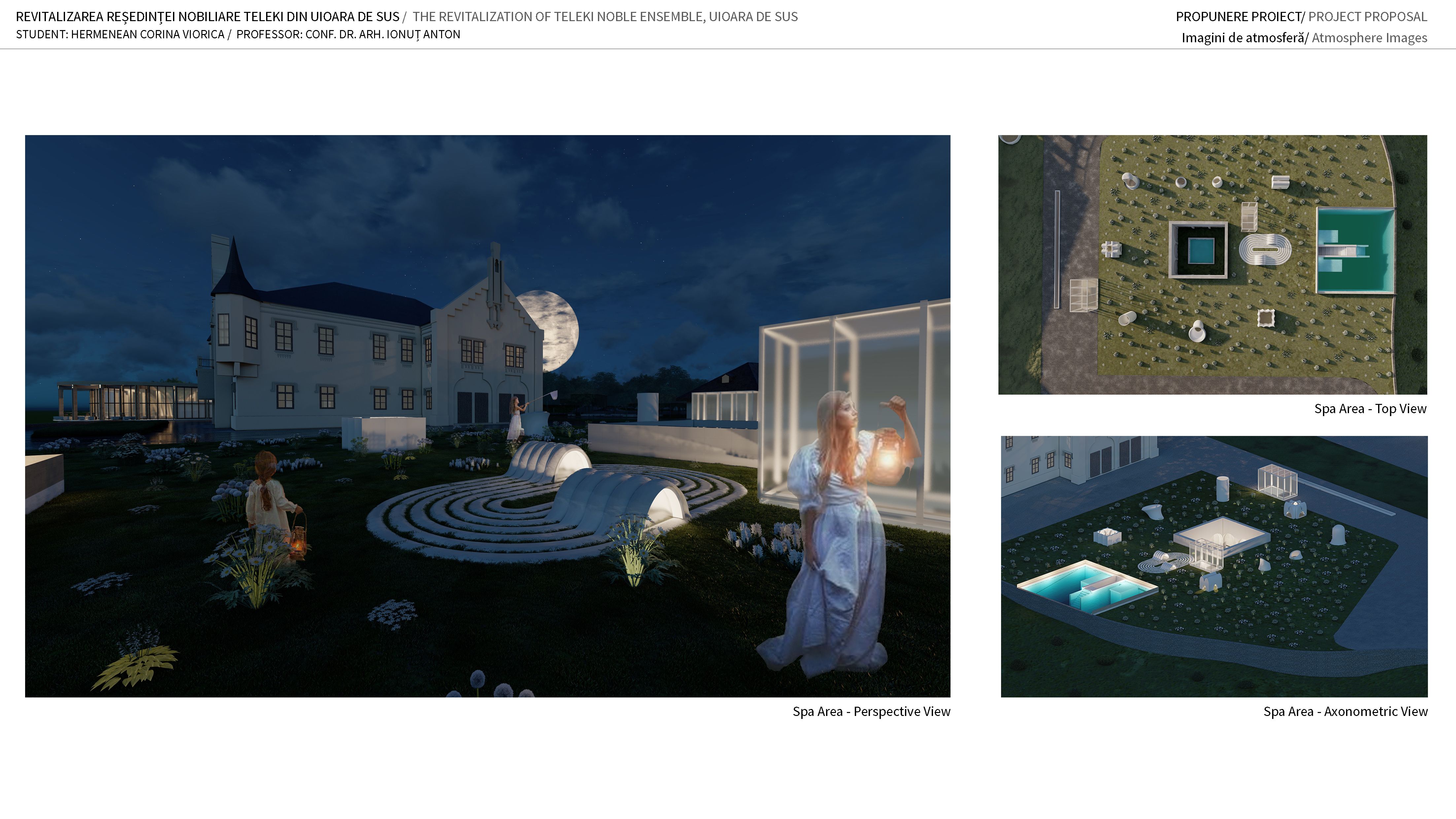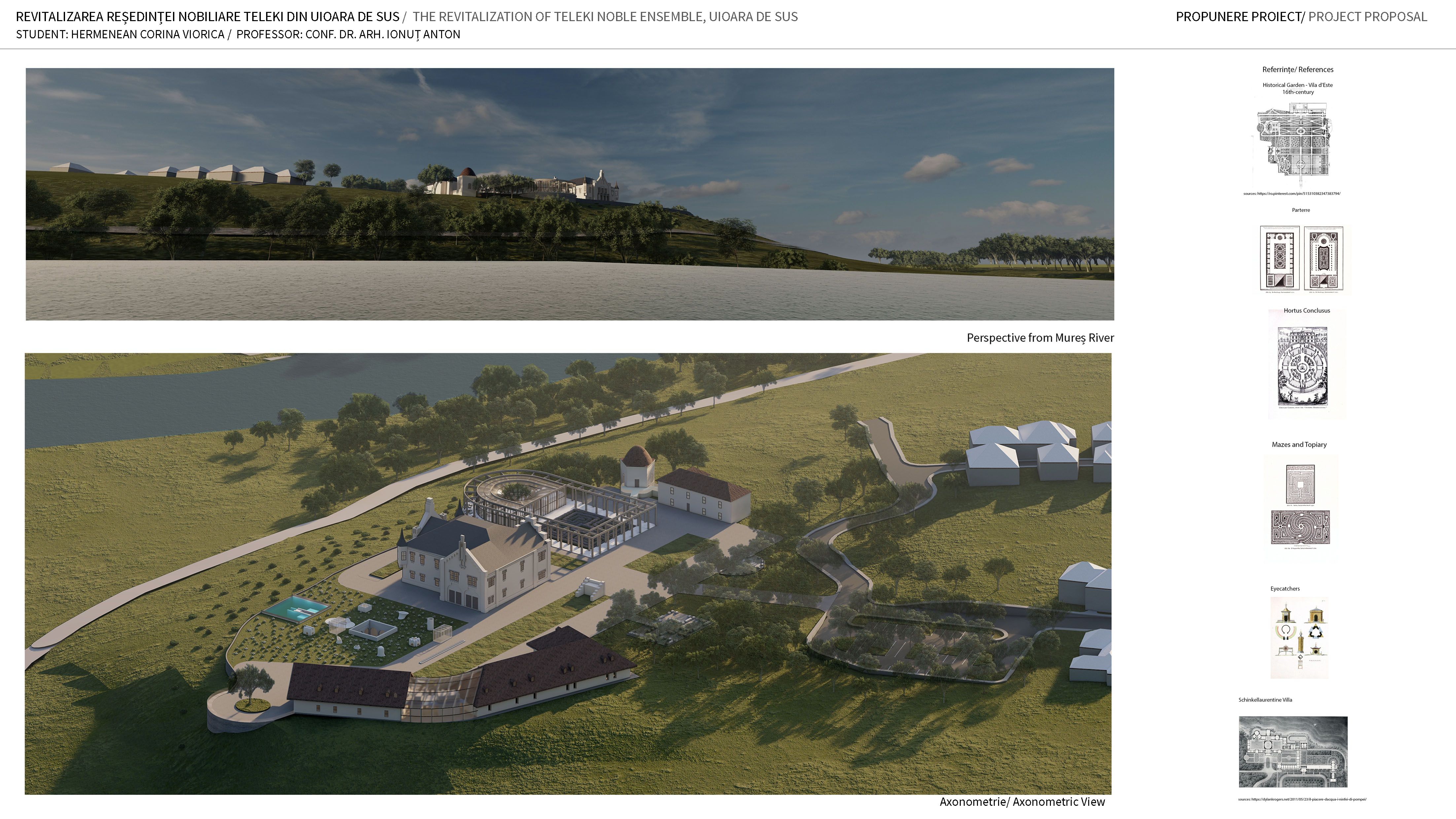 Proiectul de diplomă are ca scop revitalizarea Ansamblului Nobiliar Teleki din Uioara de Sus, orașul Ocna Mureș, Alba, România, astăzi abandonat. Forma curentă a ansamblului datează din 1856, acesta având o valoare istorică mare. Intervenția își propune să evidențieze principalele caracteristici ale ansamblului dintre care se remarcă păstrarea perspectivei dinspre Râul Mureș. Un alt element semnificativ al ansamblului este grădina istorică, astăzi dispărută. Prin raportarea la tipologia grădinilor istorice, ansamblul adoptă elemente arhitecturale reinterpretate cum ar fi porticul, labirintul și grădina închisă. Clădirile existente vor trece printr-un proces de restaurare și conversie funcțională ce le va oferi reintegrarea în viața orașului. Acestea vor deveni spații de expoziție și locuri de cazare. Clădirile noi introduse vor găzdui funcțiuni precum recepție, spa și restaurant. Spațialitatea interioară a zonei de spa a fost inspirată din arhitectura băilor romane.