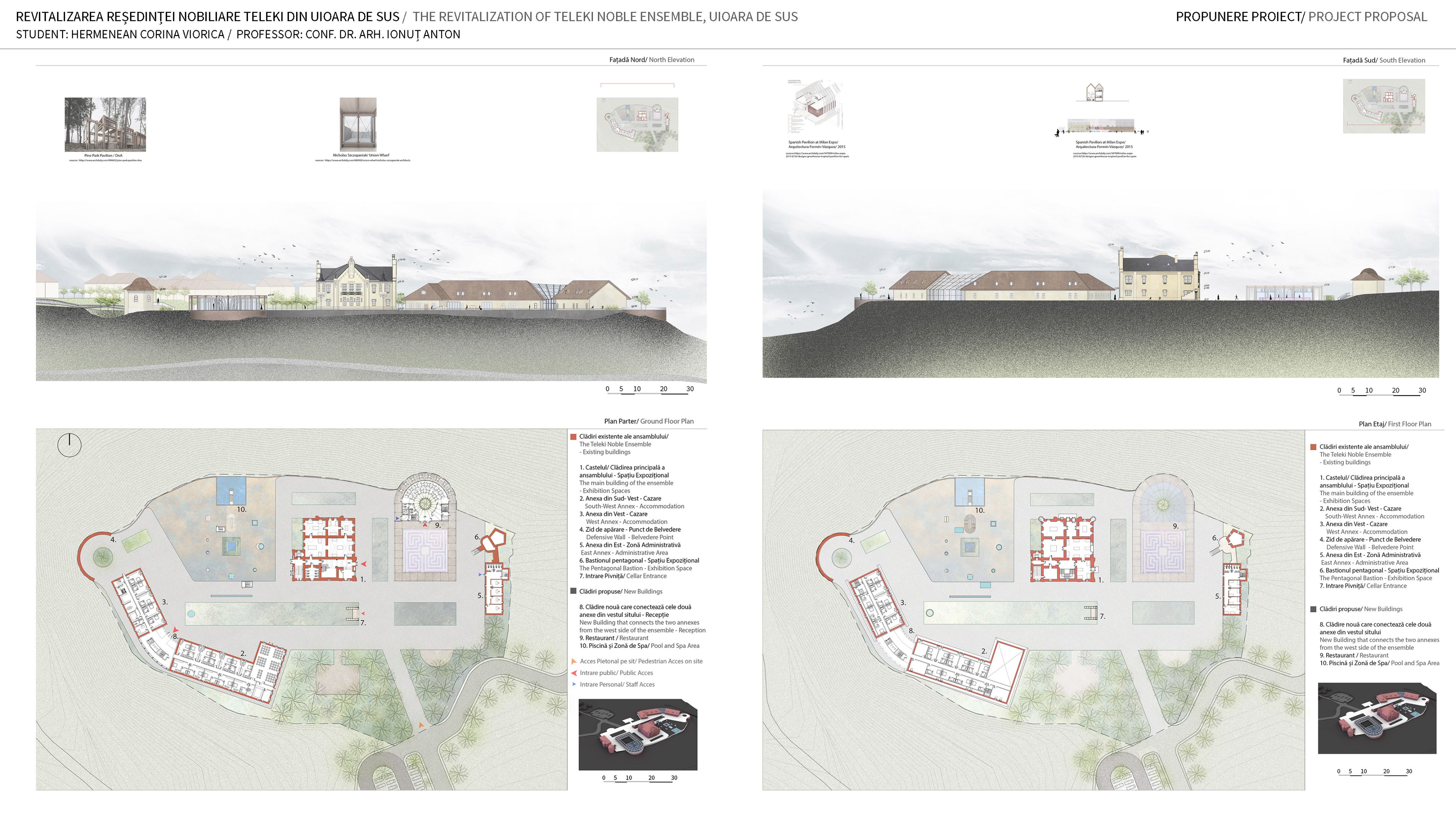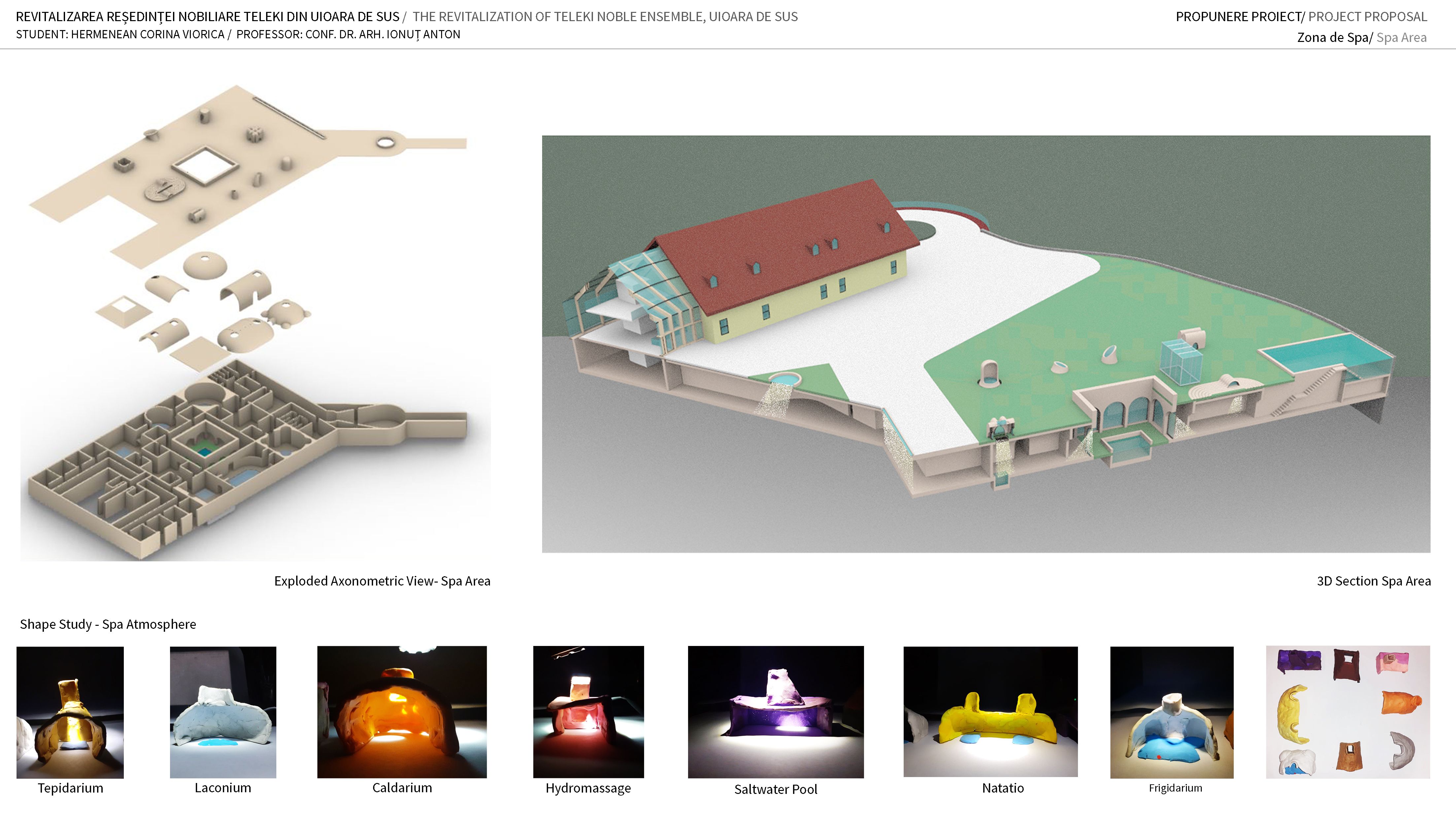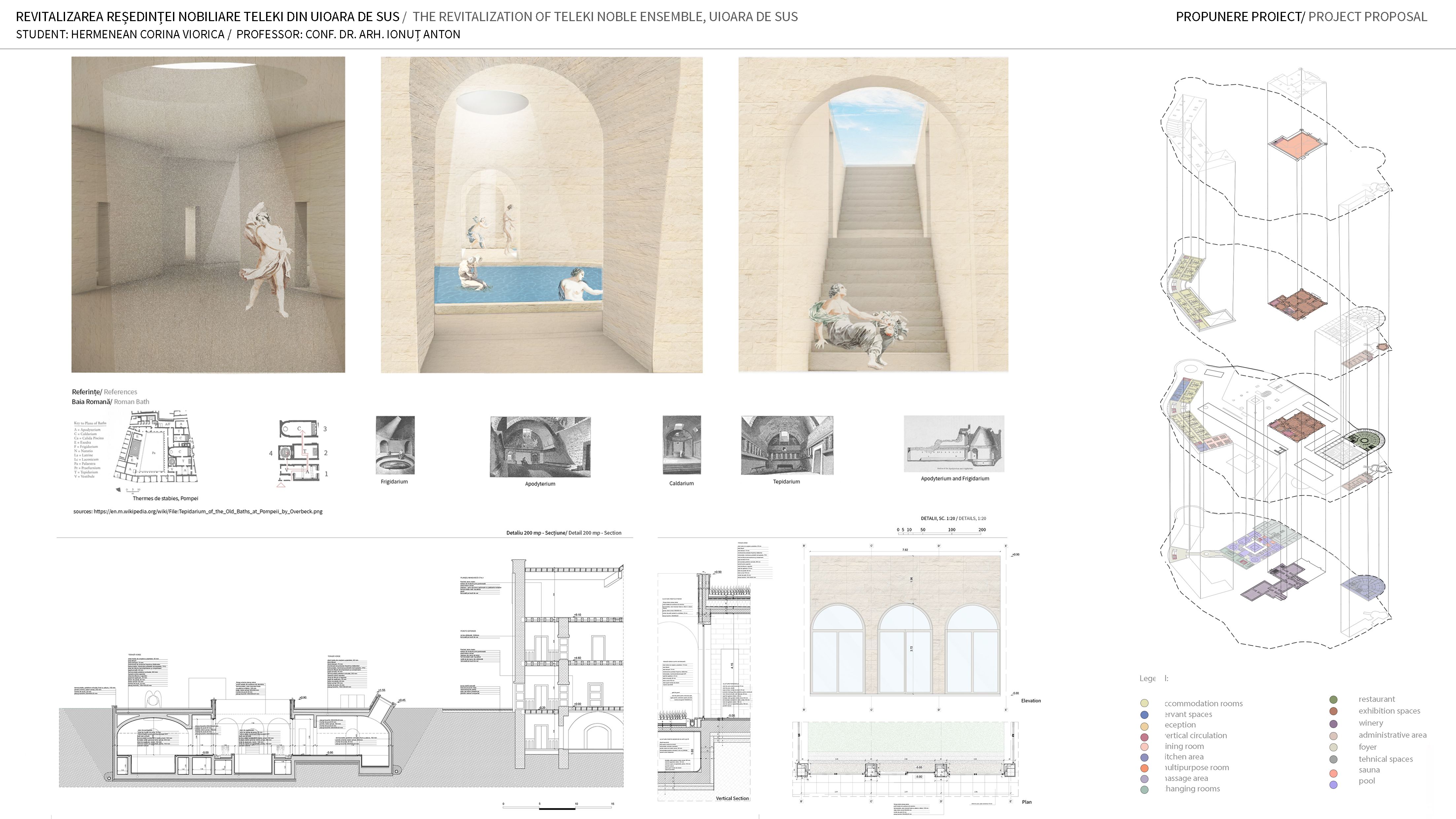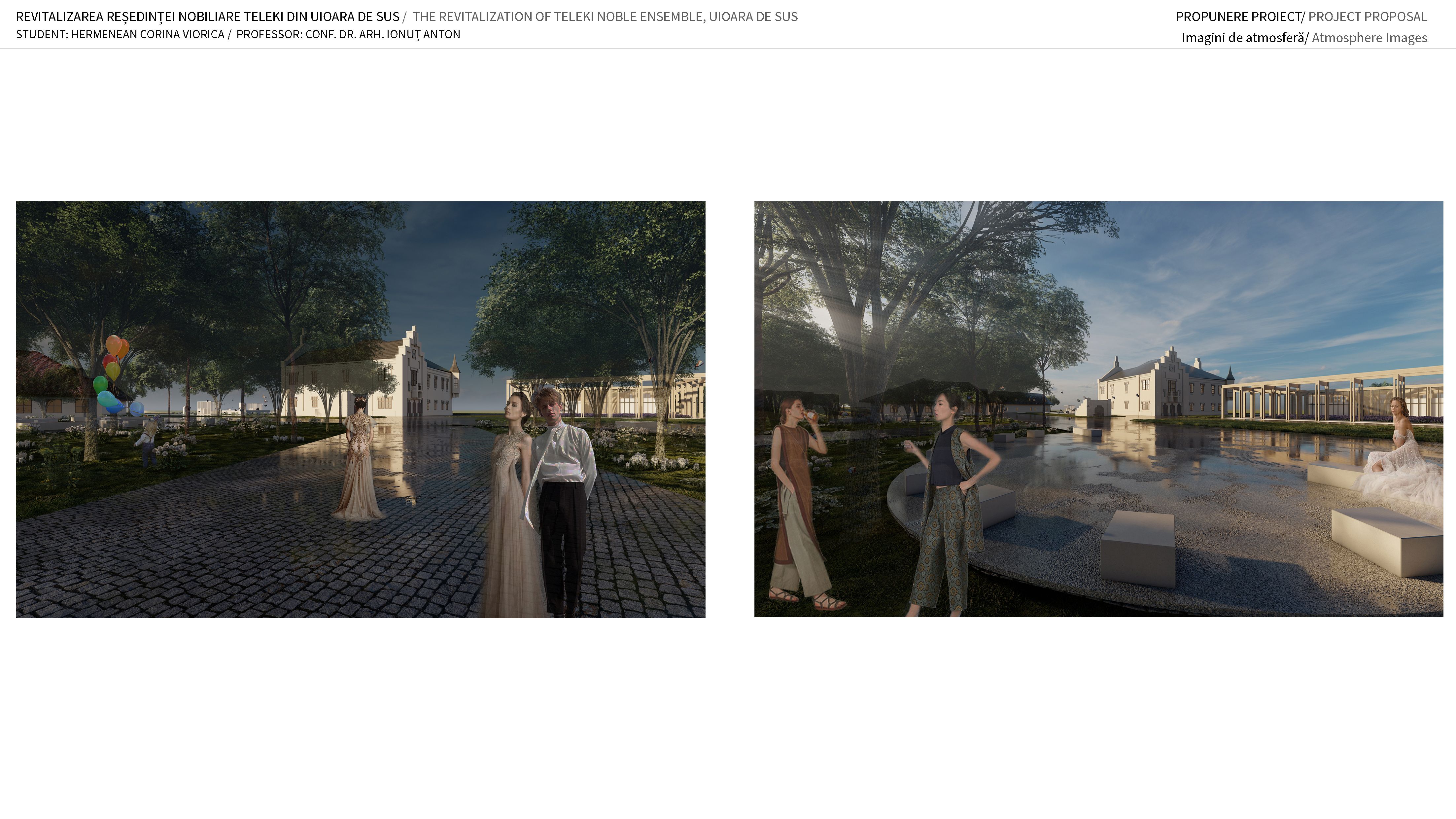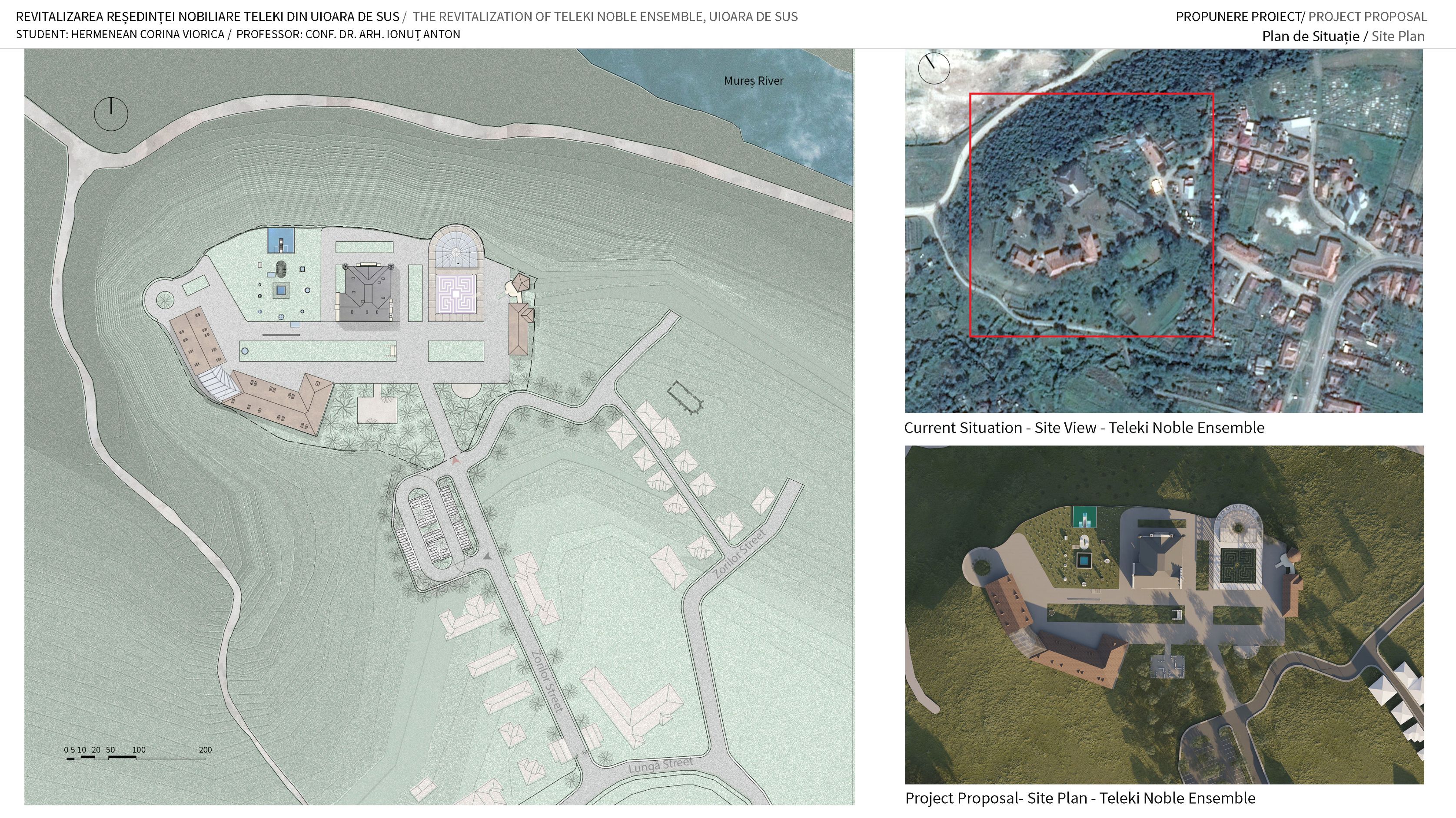 Proiectul de diplomă are ca scop revitalizarea Ansamblului Nobiliar Teleki din Uioara de Sus, orașul Ocna Mureș, Alba, România, astăzi abandonat. Forma curentă a ansamblului datează din 1856, acesta având o valoare istorică mare. Intervenția își propune să evidențieze principalele caracteristici ale ansamblului dintre care se remarcă păstrarea perspectivei dinspre Râul Mureș. Un alt element semnificativ al ansamblului este grădina istorică, astăzi dispărută. Prin raportarea la tipologia grădinilor istorice, ansamblul adoptă elemente arhitecturale reinterpretate cum ar fi porticul, labirintul și grădina închisă. Clădirile existente vor trece printr-un proces de restaurare și conversie funcțională ce le va oferi reintegrarea în viața orașului. Acestea vor deveni spații de expoziție și locuri de cazare. Clădirile noi introduse vor găzdui funcțiuni precum recepție, spa și restaurant. Spațialitatea interioară a zonei de spa a fost inspirată din arhitectura băilor romane.