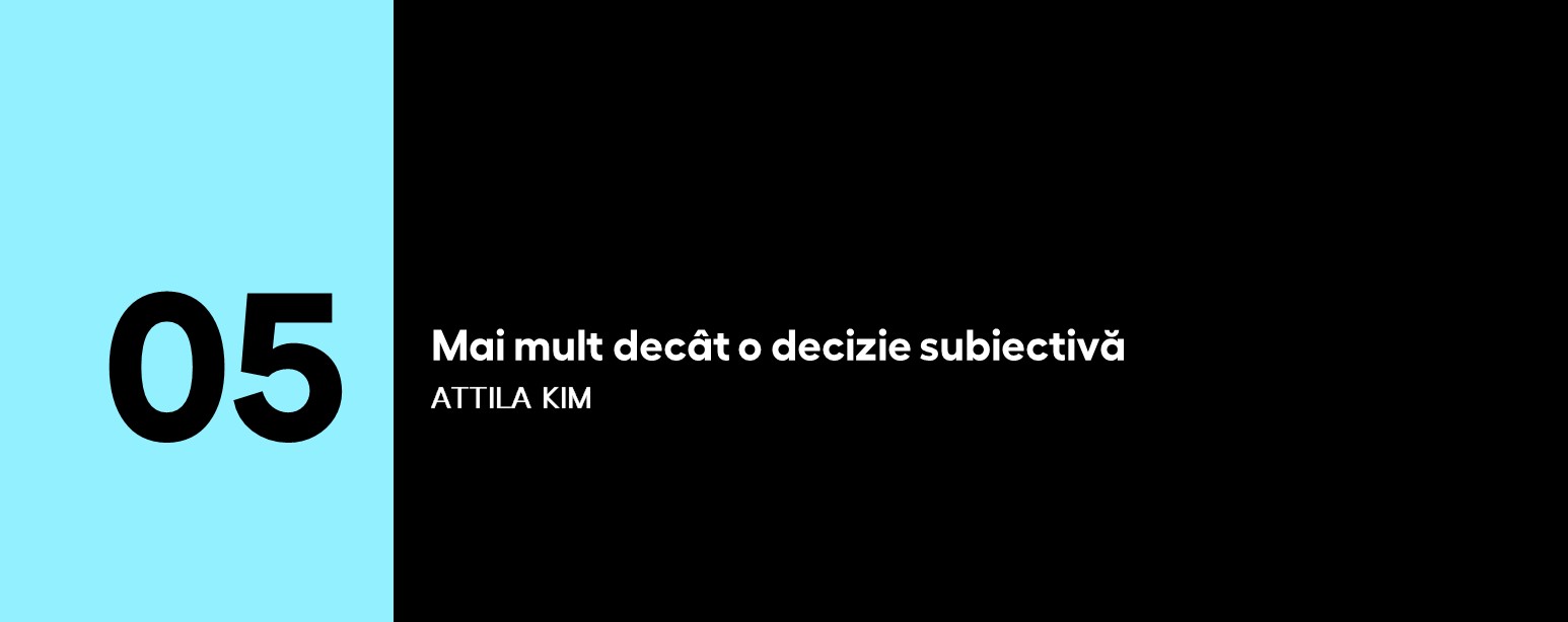 Sub numele Mai mult decât o decizie subiectivă, materialul semnat de Attila KIM conține proiectele de diplomă: (1) Cisternă Urbană, (2) A-ți face cuib în București, (3) Vilegiatură lacustră. Dunărea la Corabia, (4) Memorial pentru evreii din Bucovina. Vama Siret și (5) Promenada „La Ziduri” | Un muzeu ca un teatru și un teatru ca un muzeu realizate, în ordine, de: